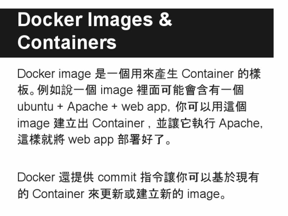 Docker image 是一個用來產生 Container 的樣 板。例如說一個 image 裡面可能會含有一個 ubuntu + Apache + web app,你可以用這個 image 建立出 Container ,並讓它執行 Apache, 這樣就將 web app 部署好了。