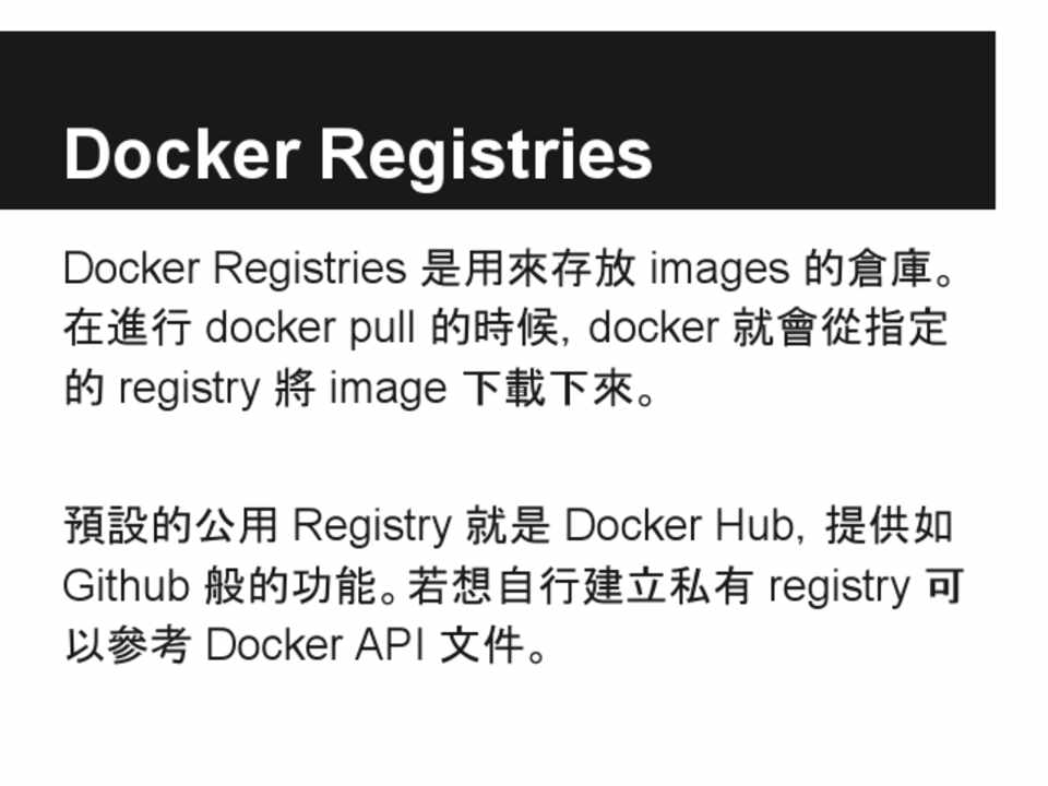 Docker Registries 是用來存放 images 的倉庫。 在進行 docker pull 的時候,docker 就會從指定 的 registry 將 image 下載下來。