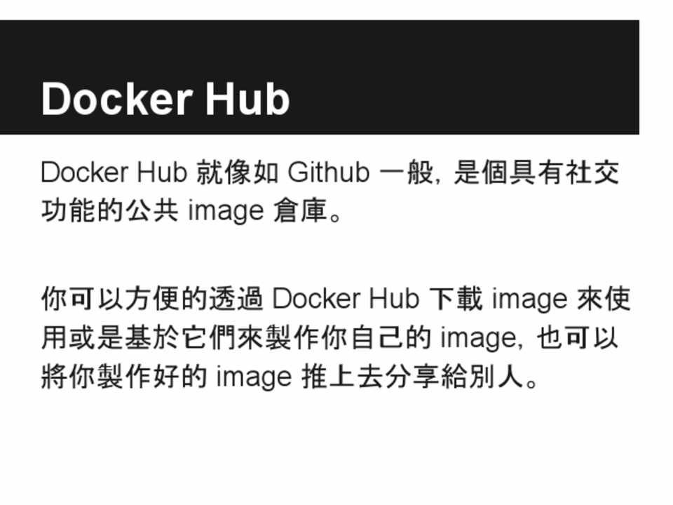 你可以方便的透過 Docker Hub 下載 image 來使 用或是基於它們來製作你自己的 image,也可以 將你製作好的 image 推上去分享給別人。