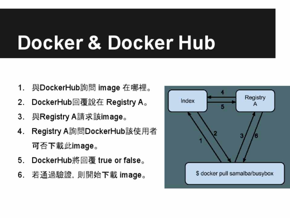 可否下載此image。 5. DockerHub將回覆 true or false。 6. 若通過驗證,則開始下載 image。