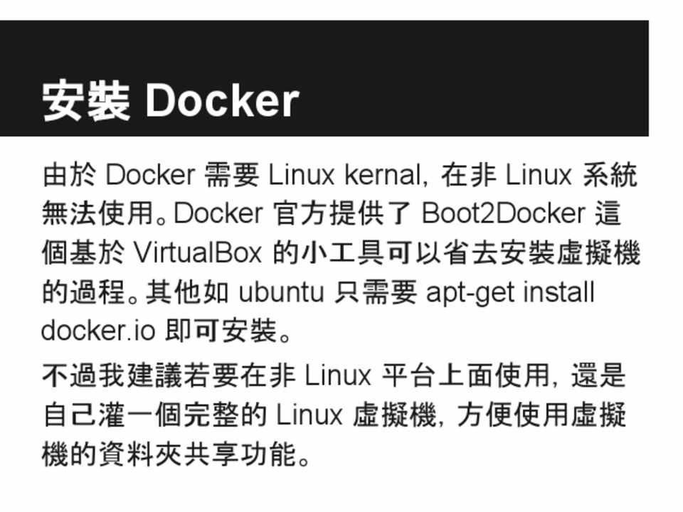 由於 Docker 需要 Linux kernal,在非 Linux 系統 無法使用。Docker 官方提供了 Boot2Docker 這 個基於 VirtualBox 的小工具可以省去安裝虛擬機 的過程。其他如 ubuntu 只需要 apt-get install docker.io 即可安裝。 不過我建議若要在非 Linux 平台上面使用,還是 自己灌一個完整的 Linux 虛擬機,方便使用虛擬 機的資料夾共享功能。