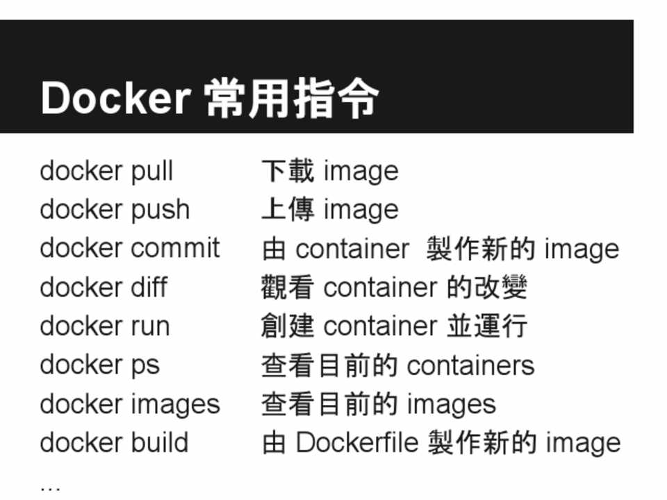 下載 image 上傳 image 由 container 製作新的 image 觀看 container 的改變 創建 container 並運行 查看目前的 containers 查看目前的 images 由 Dockerfile 製作新的 image