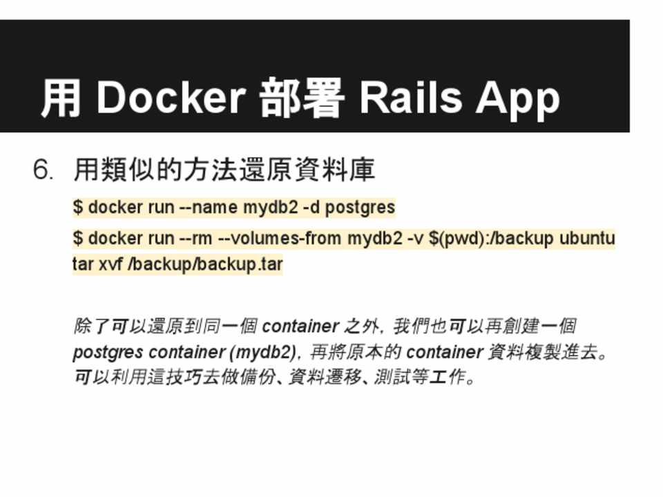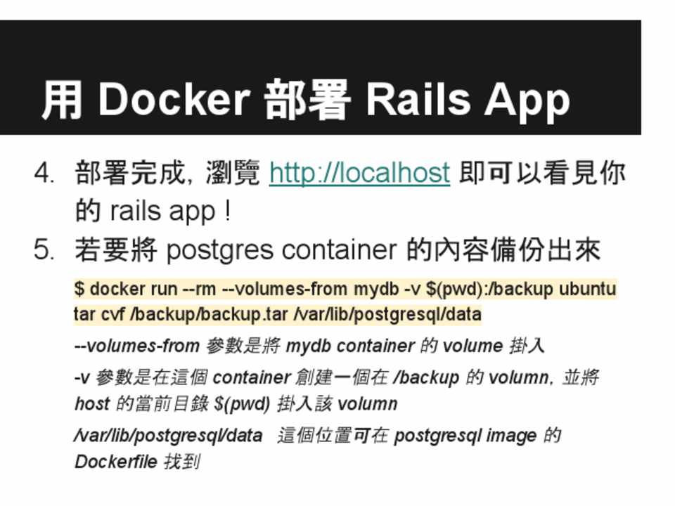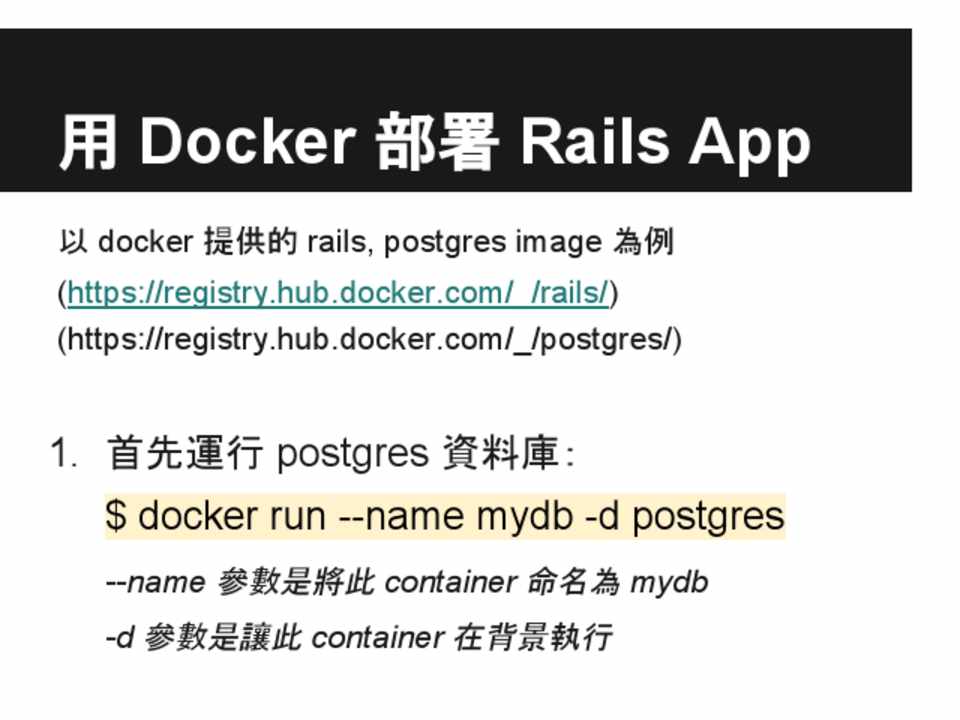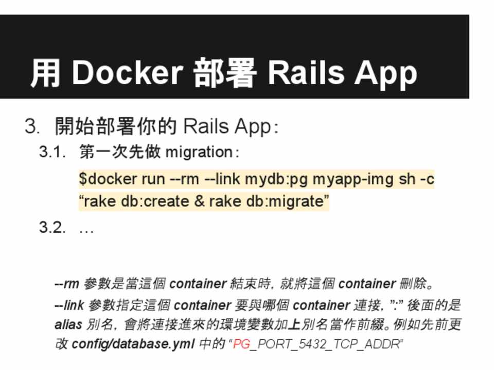 --rm 參數是當這個 container 結束時,就將這個 container 刪除。 --link 參數指定這個 container 要與哪個 container 連接,”:” 後面的是 alias 別名,會將連接進來的環境變數加上別名當作前綴。例如先前更 改 config/database.yml 中的 “PG_PORT_5432_TCP_ADDR”