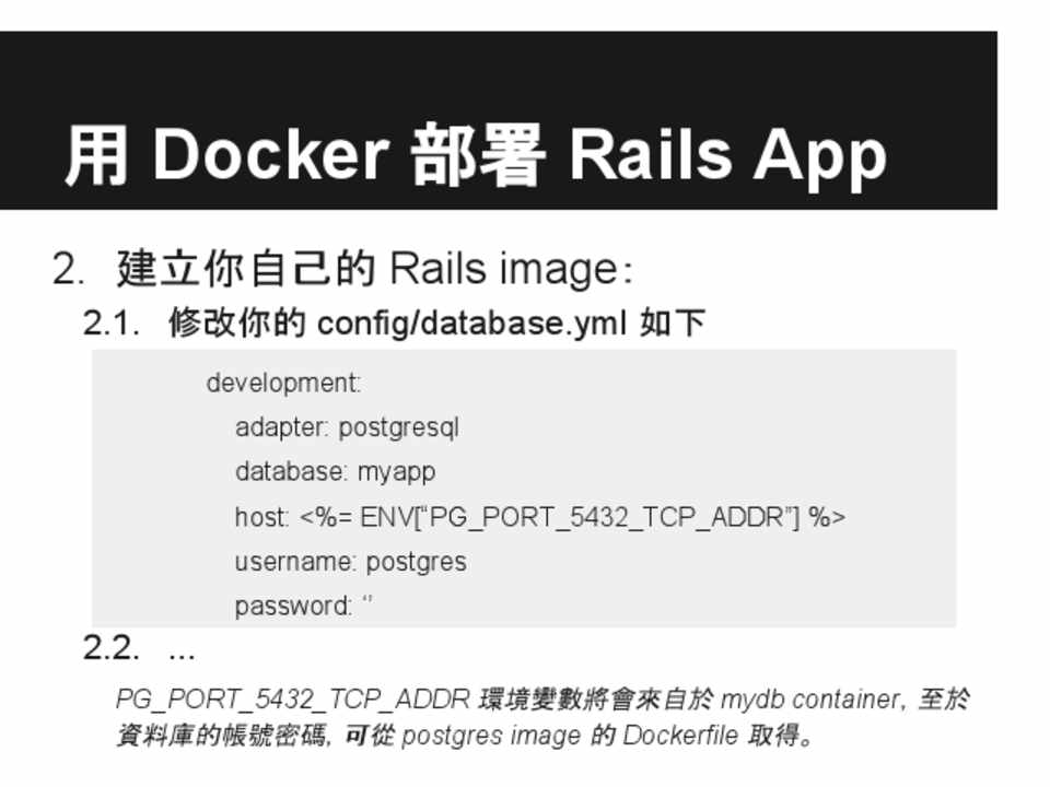 PG_PORT_5432_TCP_ADDR 環境變數將會來自於 mydb container,至於 資料庫的帳號密碼,可從 postgres image 的 Dockerfile 取得。