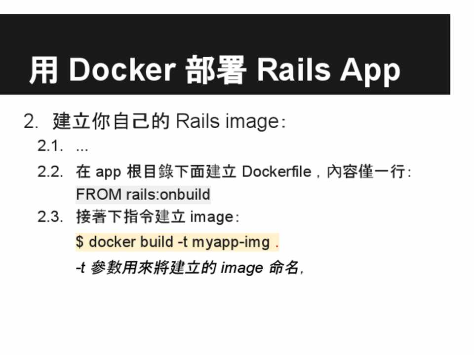FROM rails:onbuild 2.3. 接著下指令建立 image: