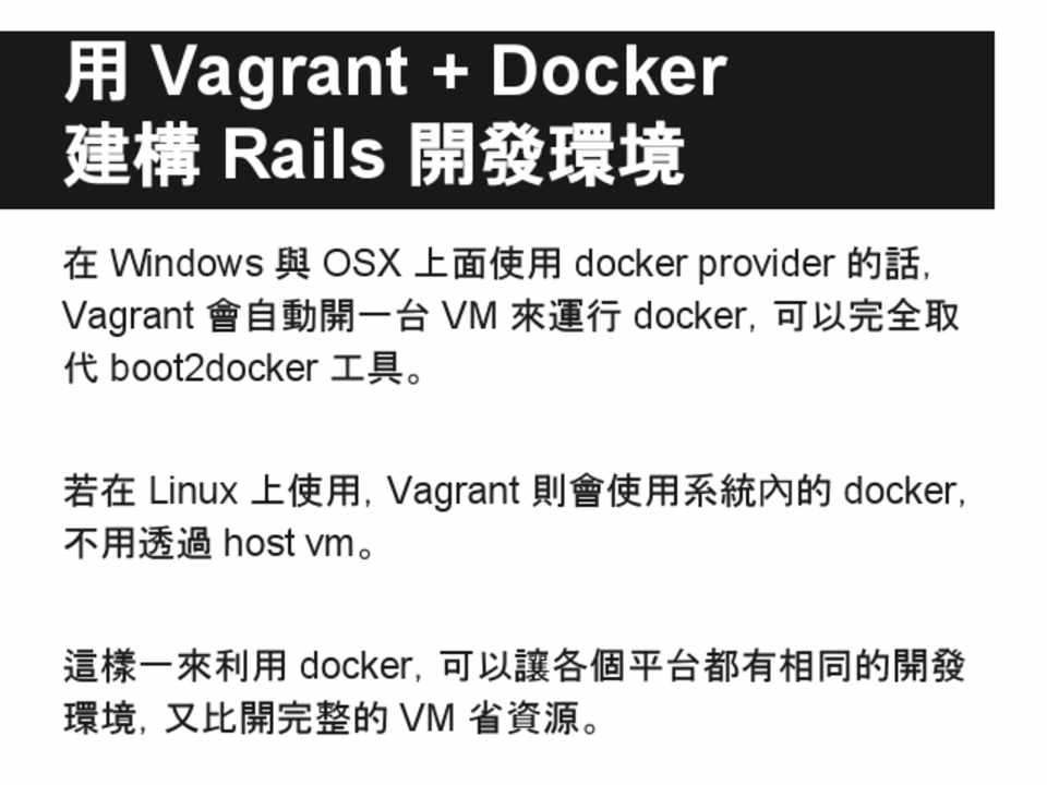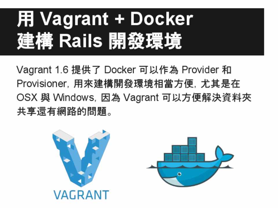 Vagrant 1.6 提供了 Docker 可以作為 Provider 和 Provisioner,用來建構開發環境相當方便,尤其是在 OSX 與 Windows,因為 Vagrant 可以方便解決資料夾 共享還有網路的問題。