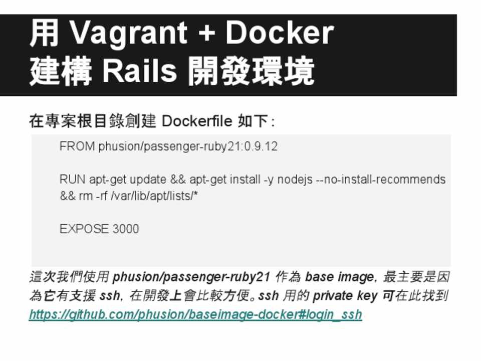 這次我們使用 phusion/passenger-ruby21 作為 base image,最主要是因 為它有支援 ssh,在開發上會比較方便。ssh 用的 private key 可在此找到 https://github.com/phusion/baseimage-docker#login_ssh