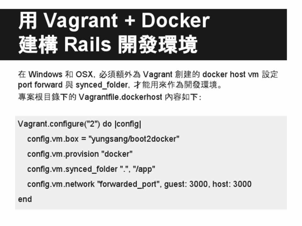 在 Windows 和 OSX,必須額外為 Vagrant 創建的 docker host vm 設定 port forward 與 synced_folder,才能用來作為開發環境。 專案根目錄下的 Vagrantfile.dockerhost 內容如下: