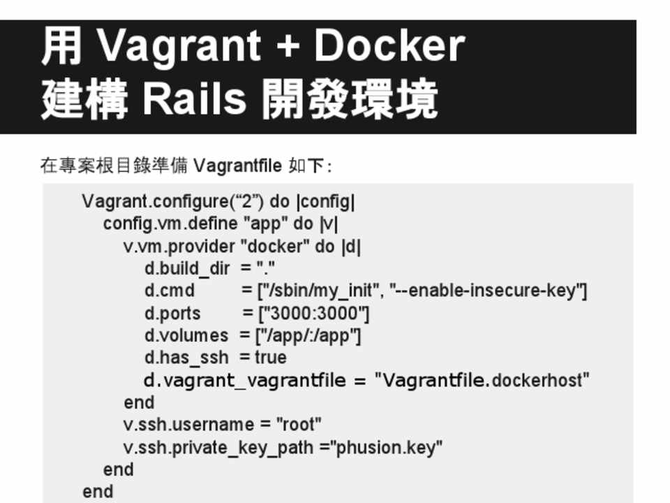 Vagrant.configure(“2”) do |config| config.vm.define "app" do |v| v.vm.provider "docker" do |d| d.build_dir = "." d.cmd = ["/sbin/my_init", "--enable-insecure-key"] d.ports = ["3000:3000"] d.volumes = ["/app/:/app"] d.has_ssh = true d.vagrant_vagrantfile = "Vagrantfile.dockerhost" end v.ssh.username = "root" v.ssh.private_key_path ="phusion.key" end