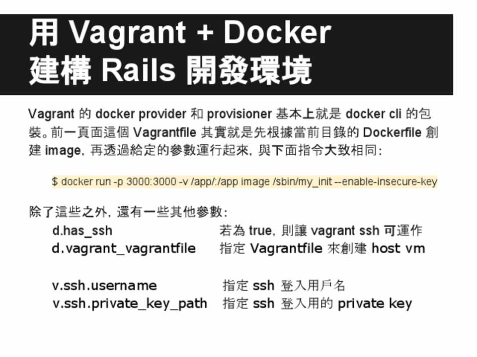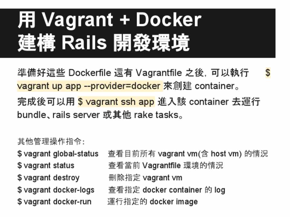 完成後可以用 $ vagrant ssh app 進入該 container 去運行 bundle、rails server 或其他 rake tasks。