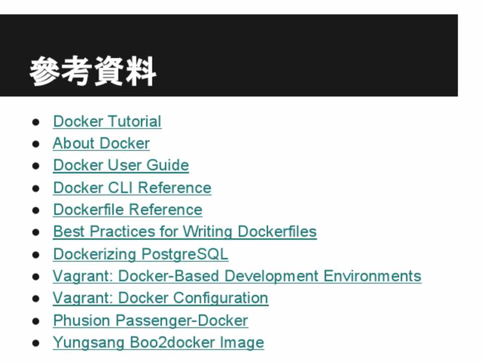 ● Docker Tutorial ● About Docker ● Docker User Guide ● Docker CLI Reference ● Dockerfile Reference ● Best Practices for Writing Dockerfiles ● Dockerizing PostgreSQL ● Vagrant: Docker-Based Development Environments ● Vagrant: Docker Configuration ● Phusion Passenger-Docker ● Yungsang Boo2docker Image