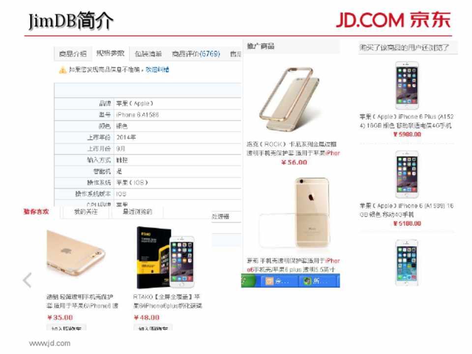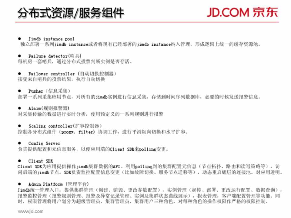 JimDB从缓存发展而来, 目前服务于京东的几乎所有的业务系统,包括 很多重要的业务系统,例如, 前台的商品详情页, 交易平台, 广告, 搜索, 即时通讯…… 后台的订单履约, 库存管理, 派送和物流……