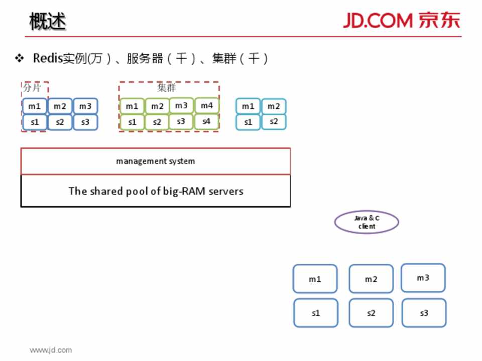 采用官方Redis作为单节点服务 客户端一致性Hash + Presharding技术 管理,监控和报警