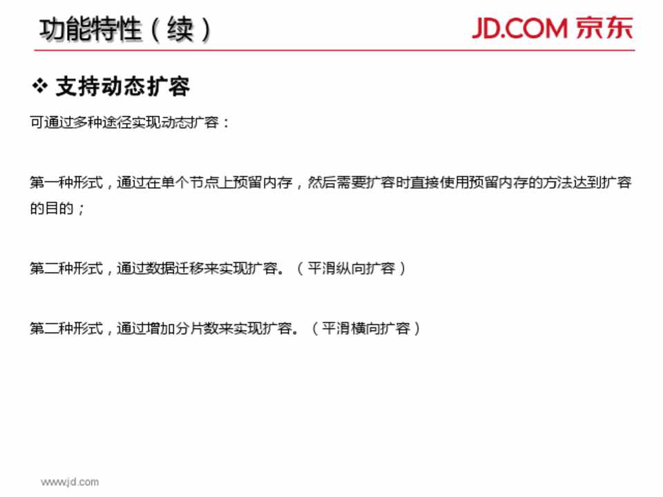 可通过多种途径实现劢态扩容: 第一种形式,通过在单个节点上预留内存,然后需要扩容时直接使用预留内存的方法达到扩容 的目的; 第二种形式,通过数据迁移来实现扩容。(平滑纵向扩容) 第二种形式,通过增加分片数来实现扩容。(平滑横向扩容)