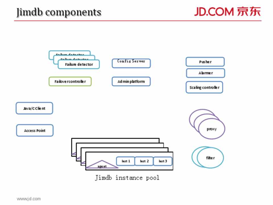 Jimdb instance pool 独立部署一系列jimdb instance或者将现有已经部署的jimdb instance纳入管理,形成逻辑上统一的缓存资源池。