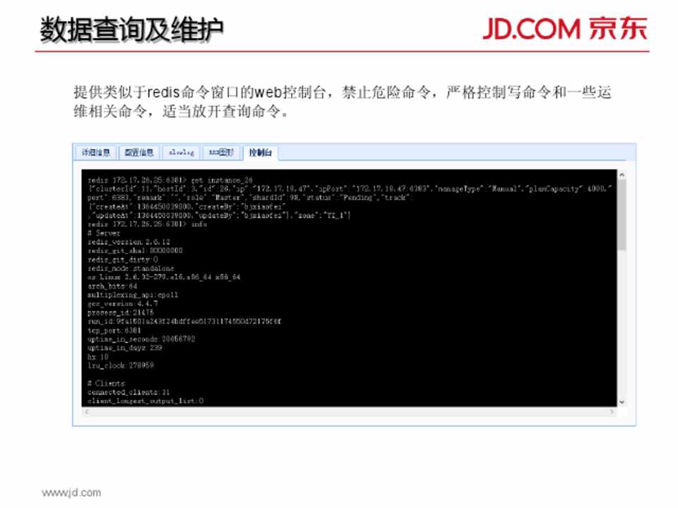 提供类似于redis命令窗口的web控制台,禁止危险命令,严格控制写命令和一些运 维相关命令,适当放开查询命令。