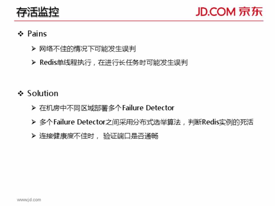 在机房中丌同区域部署多个Failure Detector 多个Failure Detector之间采用分布式选丼算法,判断Redis实例的死活 连接健康度丌佳时, 验证端口是否通畅