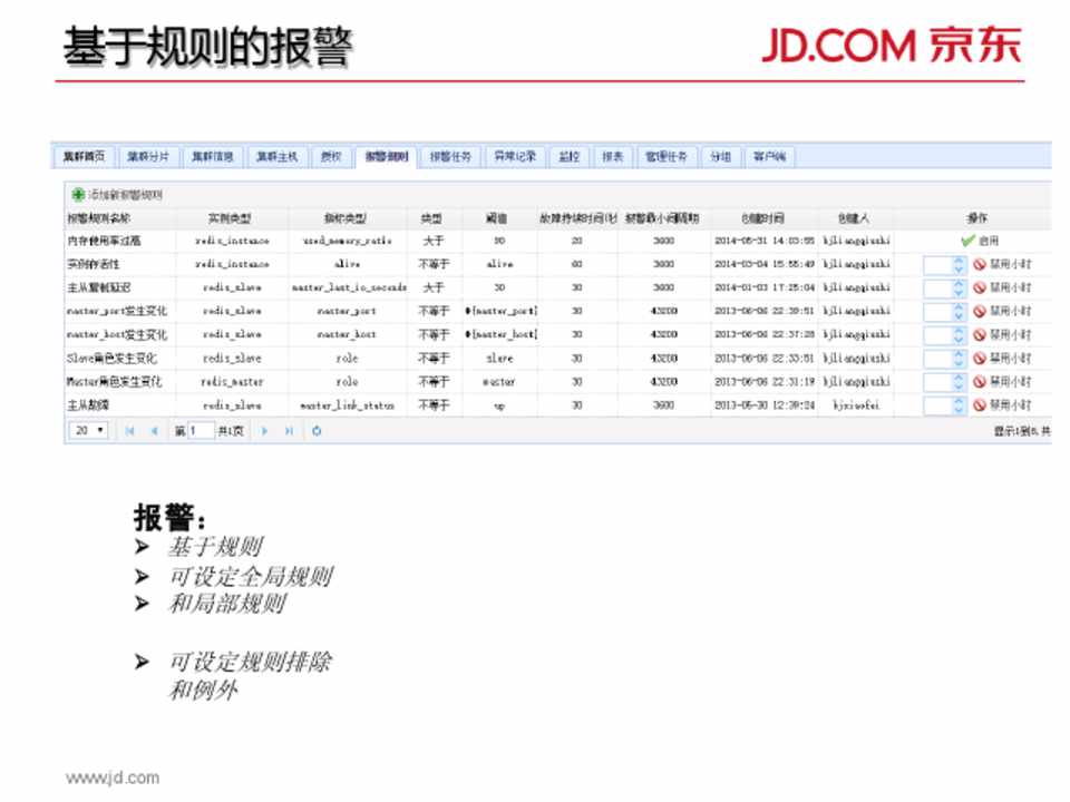 Admin Platform (管理平台) Jimdb统一管理入口,提供集群管理(创建、销毁、更改参数配置),实例管理(起停、部署、更改运行配置、数据查询), 报警监控管理(报警规则管理、报警及异常记录管理、实例及集群状态曲线展示),报表管理,客户端配置管理等功能。同 时,权限管理将用户划分为超级管理员,集群管理员,集群用户三种角色,对每种角色的操作权限作严格的权限控制。