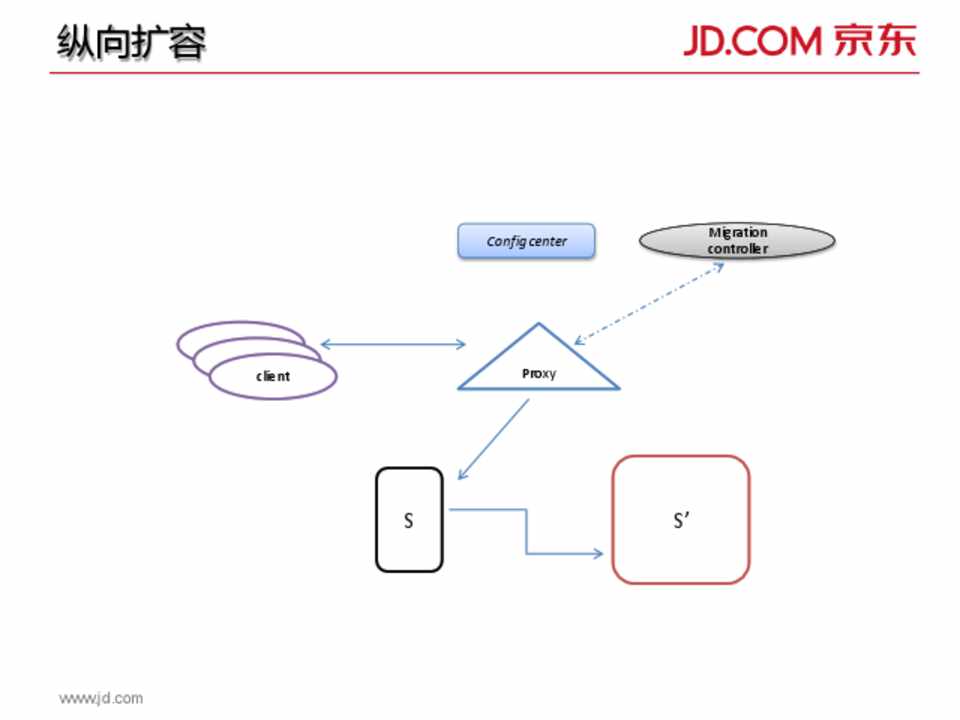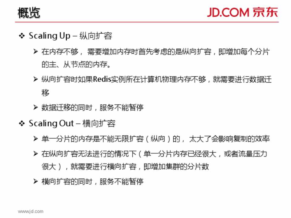 垂直扩容并丌增加分片数,简单修改jimdb实例运行时参数可提高该实例可用内存上限, 但在机器内存吃紧时,若要提高该分片内存上限,需要将该实例平滑迁移至一台内存资 源更加充沛的机器。