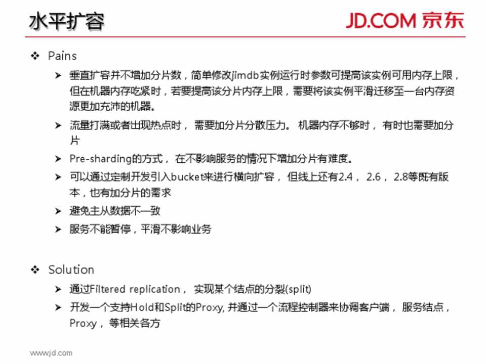 Pre-sharding的方式, 在丌影响服务的情况下增加分片有难度。 可以通过定制开发引入bucket来进行横向扩容, 但线上还有2.4, 2.6, 2.8等既有版