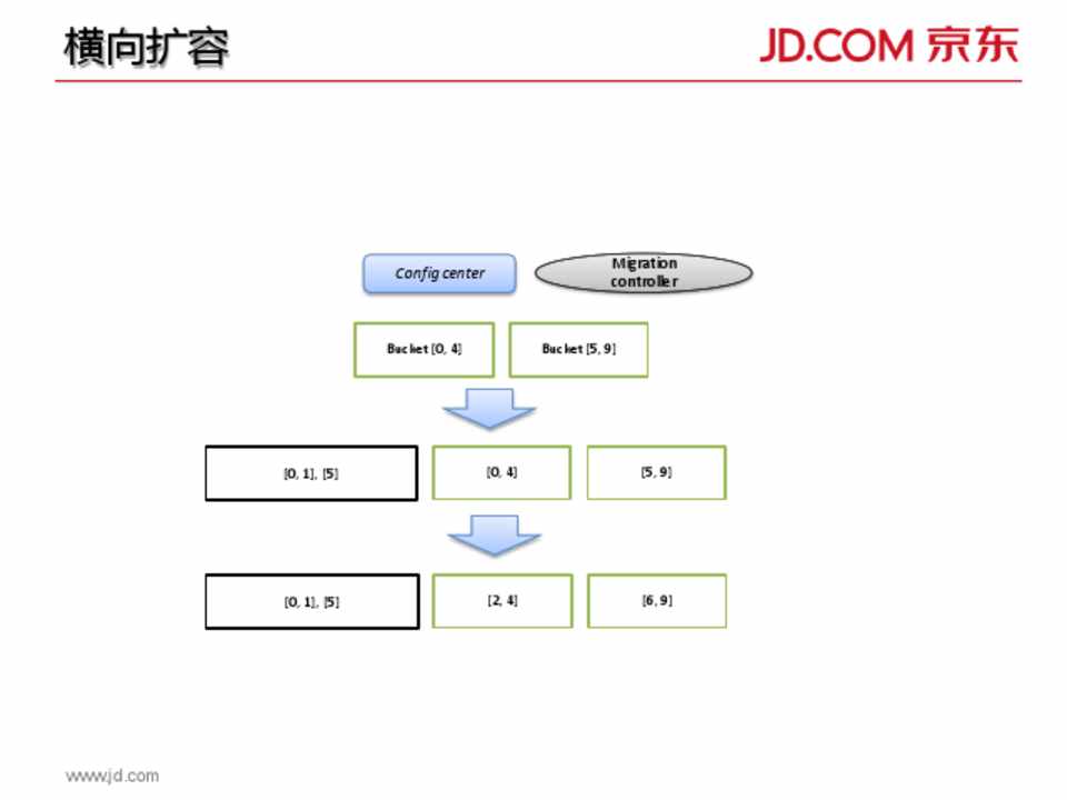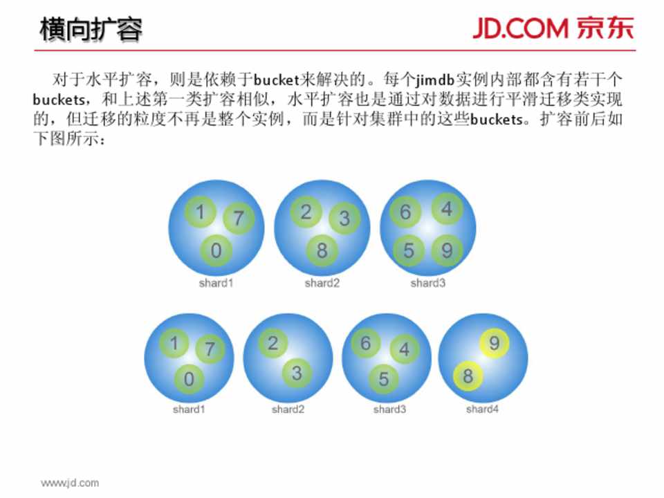 对于水平扩容,则是依赖于bucket来解决的。每个jimdb实例内部都含有若干个 buckets,和上述第一类扩容相似,水平扩容也是通过对数据进行平滑迁移类实现 的,但迁移的粒度不再是整个实例,而是针对集群中的这些buckets。扩容前后如 下图所示: