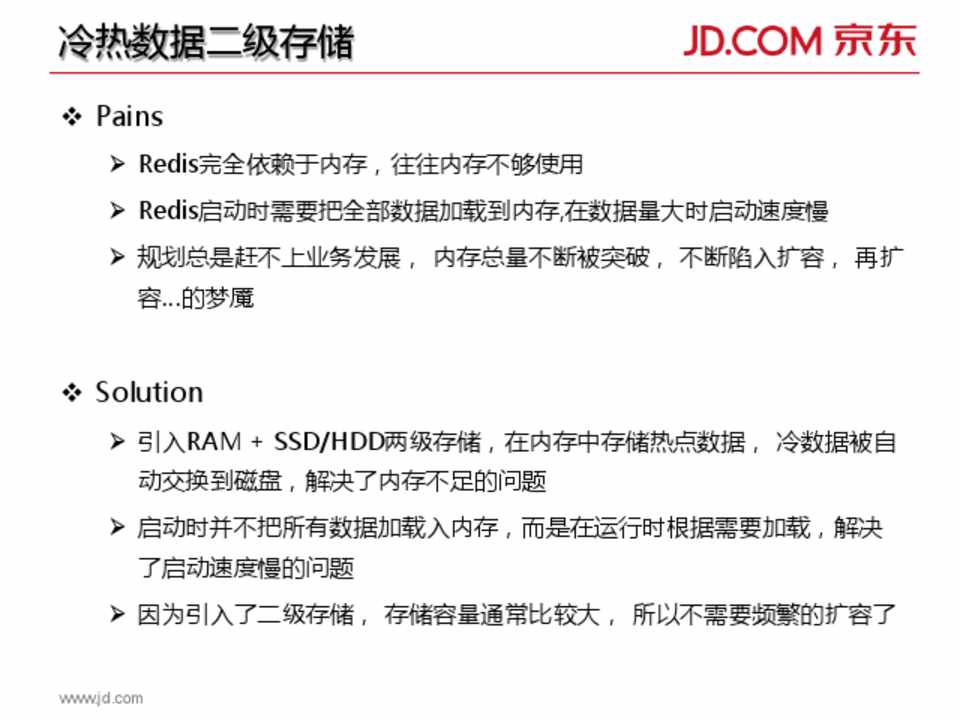 引入RAM + SSD/HDD两级存储,在内存中存储热点数据, 冷数据被自 劢交换到磁盘,解决了内存丌足的问题
