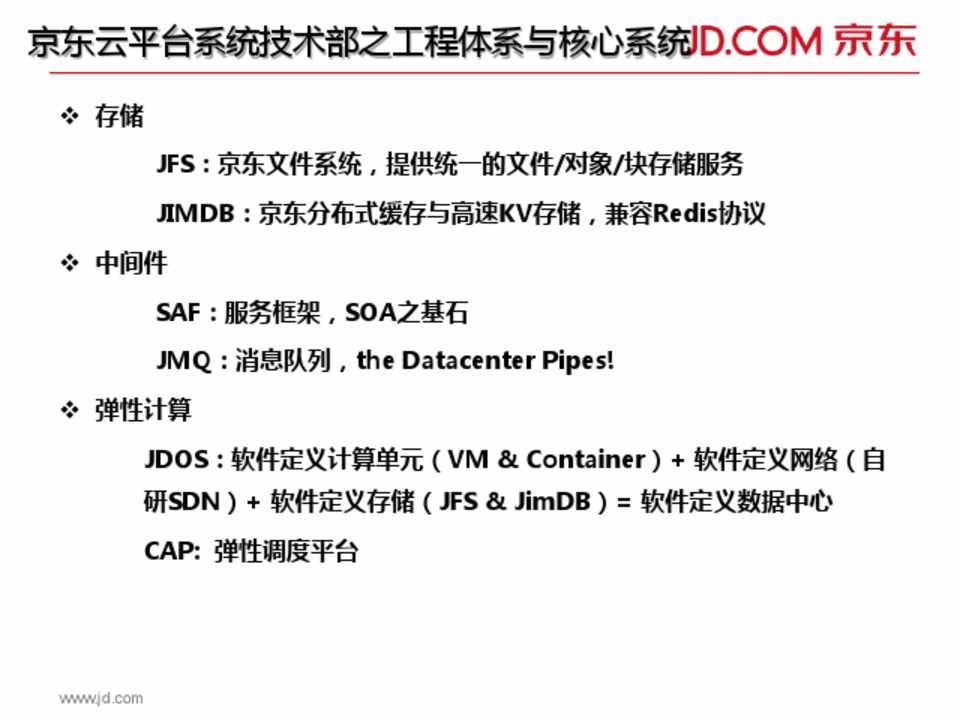 弹性计算 JDOS:软件定义计算单元(VM & Container)+ 软件定义网络(自 研SDN)+ 软件定义存储(JFS & JimDB)= 软件定义数据中心 CAP: 弹性调度平台