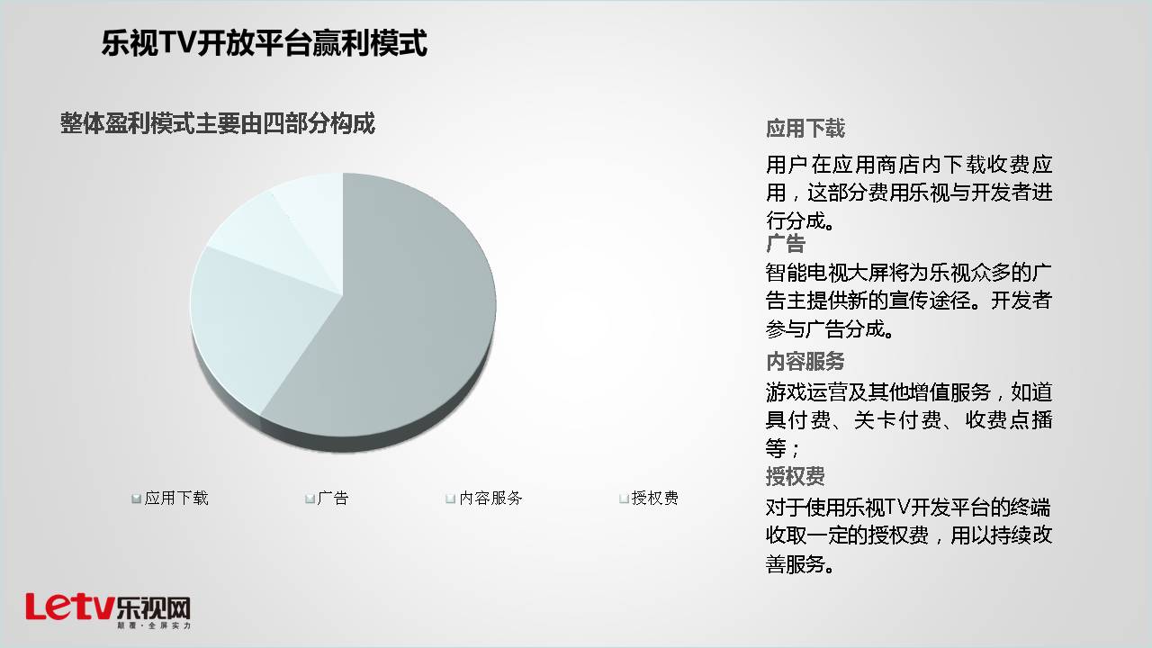 对于使用乐视TV开发平台的终端收取一定的授权费,用以持续改善服务。