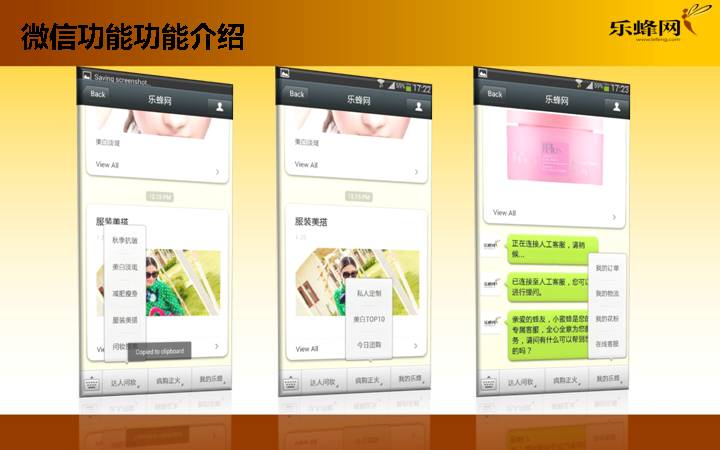 2013年7月随着微信迅速发展和微信第三方技术的成熟,乐蜂适时增加了公众服务号,满足用户在微信上购买需求,同时提供个人信息查询、商品咨询及在线客服等功能。