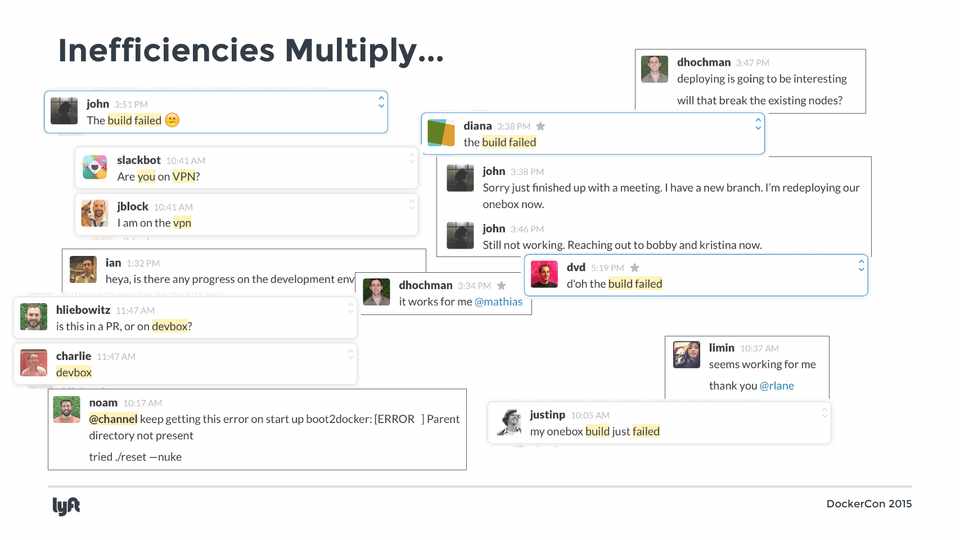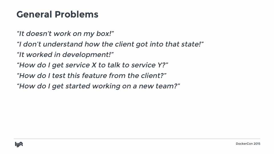 “It doesn’t work on my box!” “I don’t understand how the client got into that state!” “It worked in development!” “How do I get service X to talk to service Y?” “How do I test this feature from the client?” “How do I get started working on a new team?”