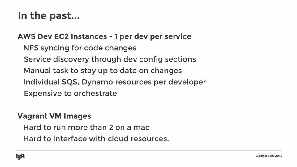 AWS Dev EC2 Instances - 1 per dev per service NFS syncing for code changes Service discovery through dev config sections Manual task to stay up to date on changes Individual SQS, Dynamo resources per developer Expensive to orchestrate