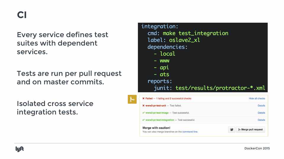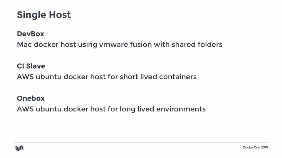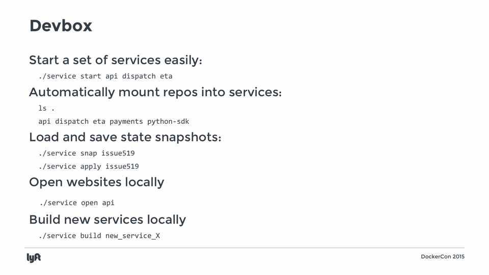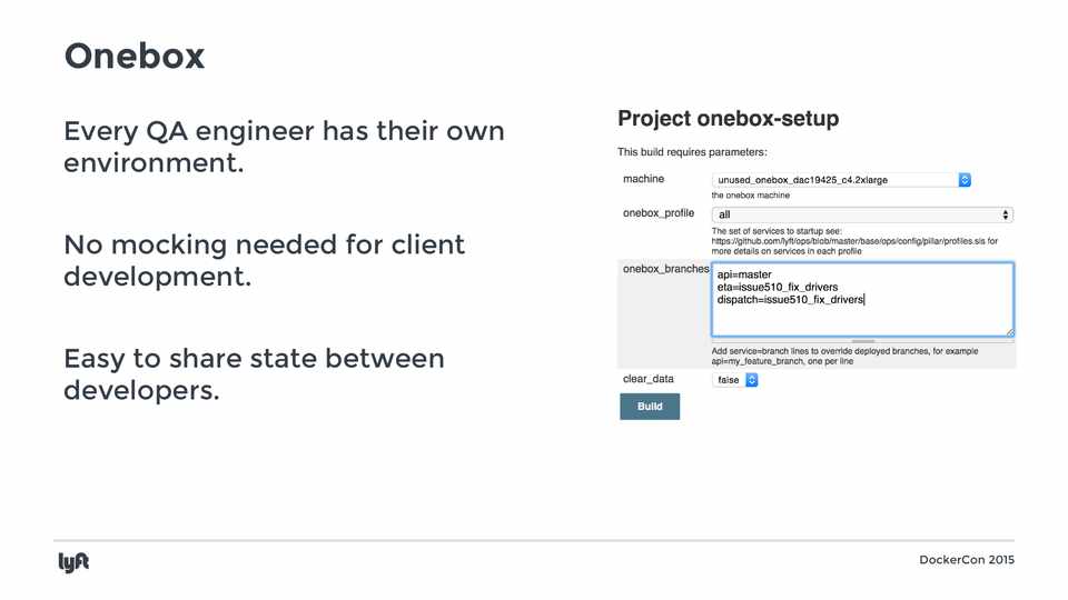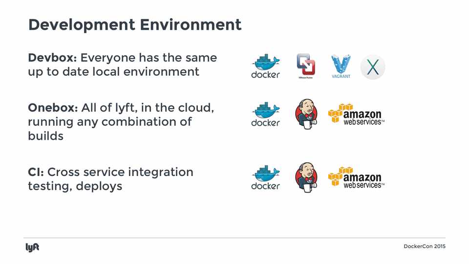 Devbox: Everyone has the same up to date local environment Onebox: All of lyft, in the cloud, running any combination of builds CI: Cross service integration testing, deploys