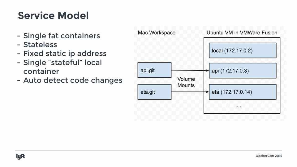 - Single fat containers - Stateless - Fixed static ip address - Single “stateful” local