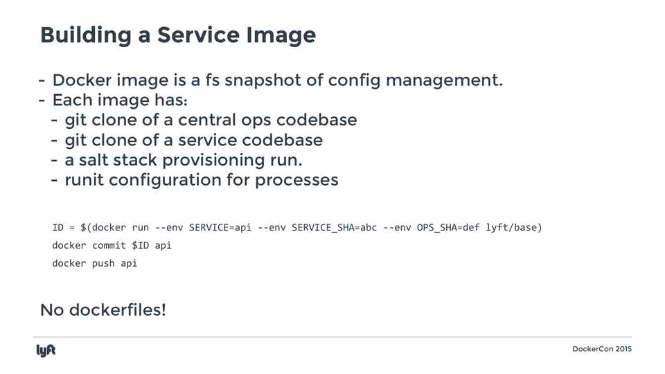 ID = $(docker run --env SERVICE=api --env SERVICE_SHA=abc --env OPS_SHA=def lyft/base) docker commit $ID api docker push api