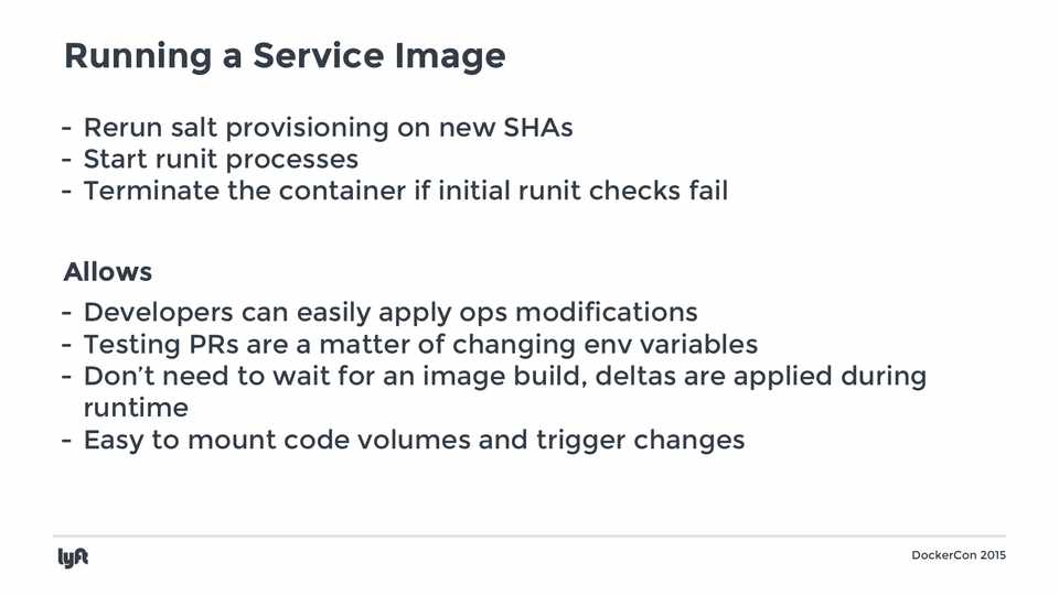 - Rerun salt provisioning on new SHAs - Start runit processes - Terminate the container if initial runit checks fail Allows - Developers can easily apply ops modifications - Testing PRs are a matter of changing env variables - Don’t need to wait for an image build, deltas are applied during