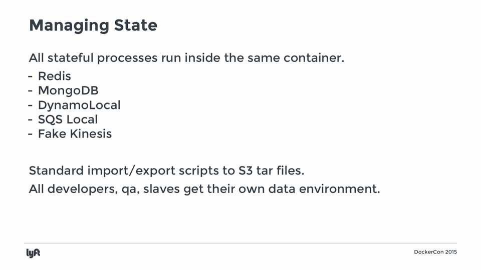 All stateful processes run inside the same container. - Redis - MongoDB - DynamoLocal - SQS Local - Fake Kinesis Standard import/export scripts to S3 tar files. All developers, qa, slaves get their own data environment.