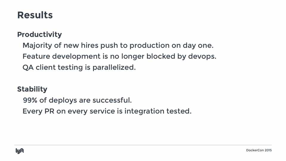 Productivity Majority of new hires push to production on day one. Feature development is no longer blocked by devops. QA client testing is parallelized.