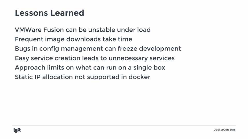 VMWare Fusion can be unstable under load Frequent image downloads take time Bugs in config management can freeze development Easy service creation leads to unnecessary services Approach limits on what can run on a single box Static IP allocation not supported in docker