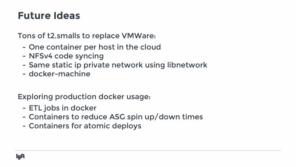 Exploring production docker usage: - ETL jobs in docker - Containers to reduce ASG spin up/down times - Containers for atomic deploys