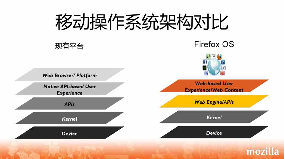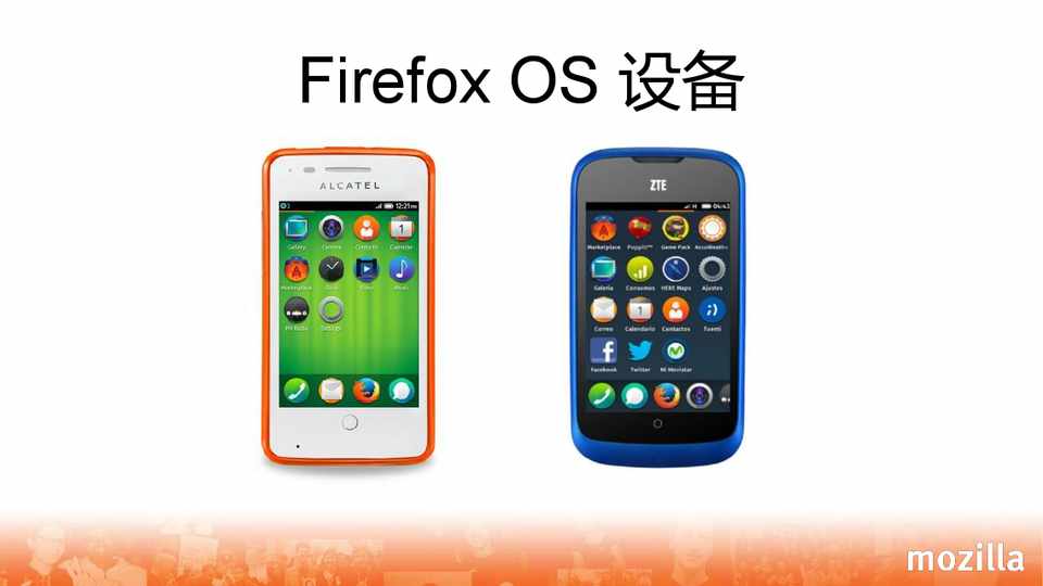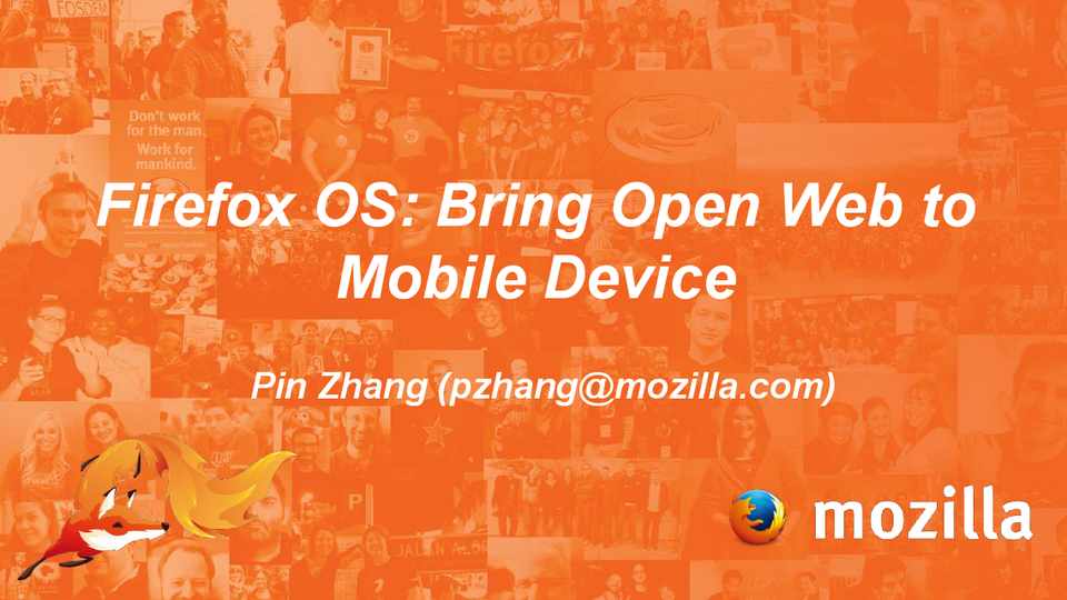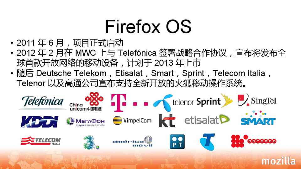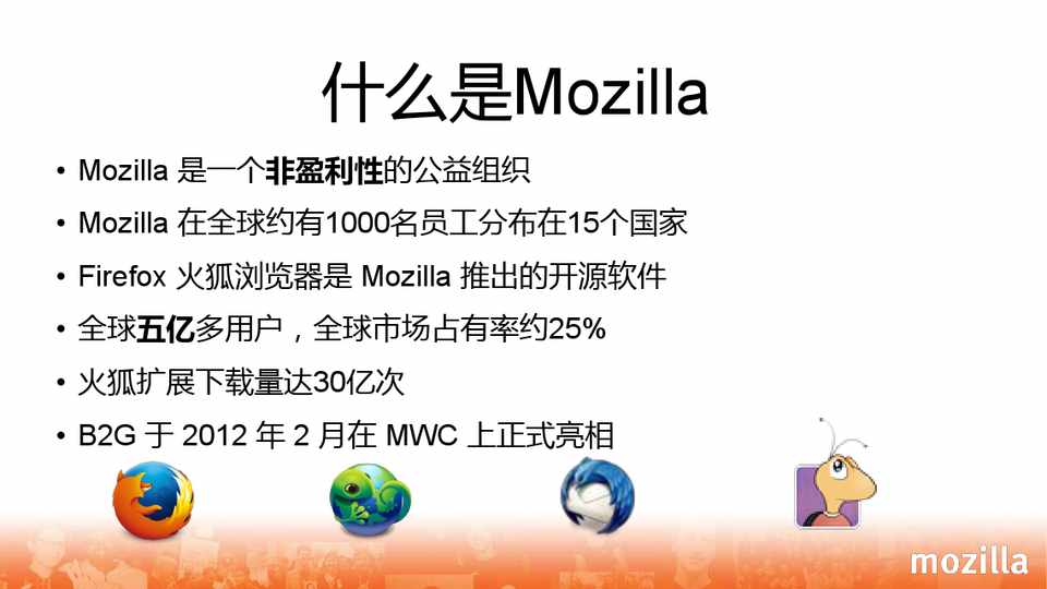 • Mozilla 是一个非盈利性的公益组织 • Mozilla 在全球约有1000名员工分布在15个国家 • Firefox 火狐浏览器是 Mozilla 推出的开源软件 • 全球五亿多用户,全球市场占有率约25% • 火狐扩展下载量达30亿次 • B2G 于 2012 年 2 月在 MWC 上正式亮相