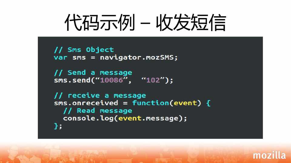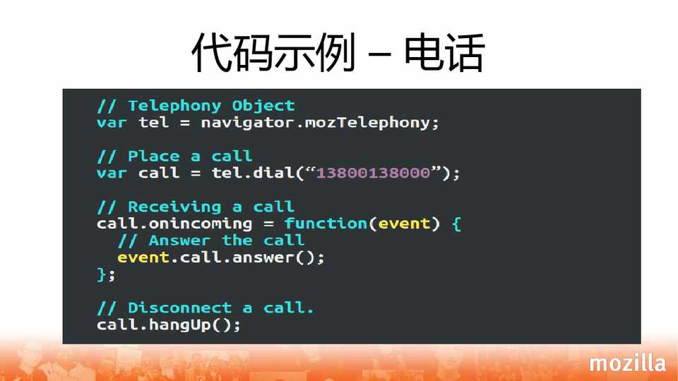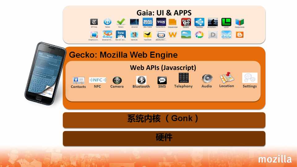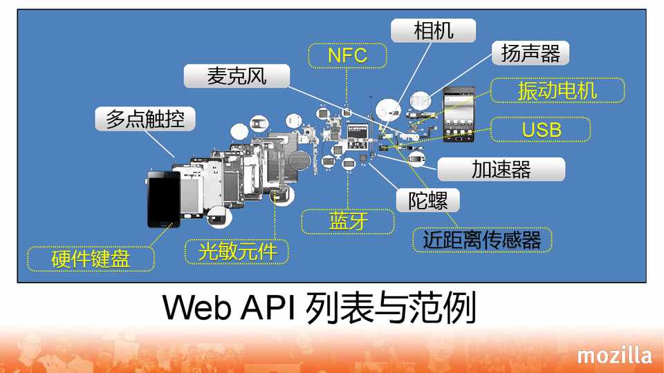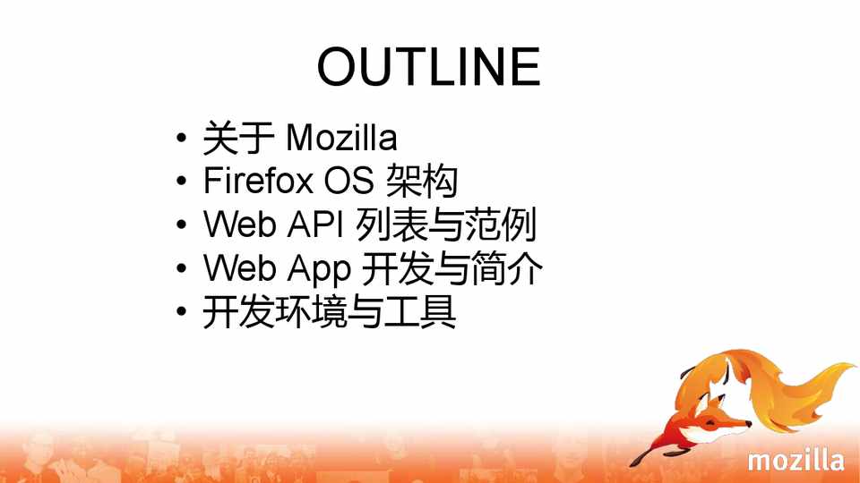 • 关于 Mozilla • Firefox OS 架构 • Web API 列表不范例 • Web App 开发不简介 • 开发环境不工具