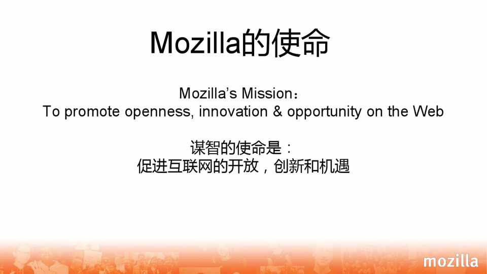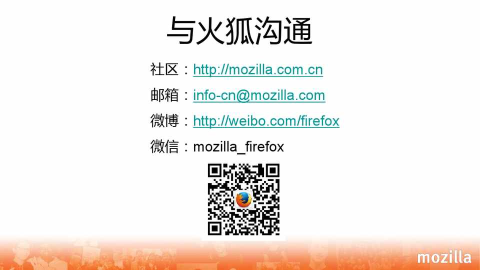 社区:http://mozilla.com.cn 邮箱:info-cn@mozilla.com 微博:http://weibo.com/firefox 微信:mozilla_firefox