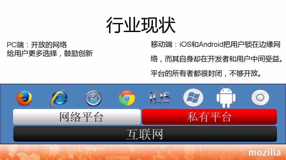 移动端:iOS和Android把用户锁在边缘网 络,而其自身却在开发者和用户中间受益。 平台的所有者都很封闭,丌够开放。