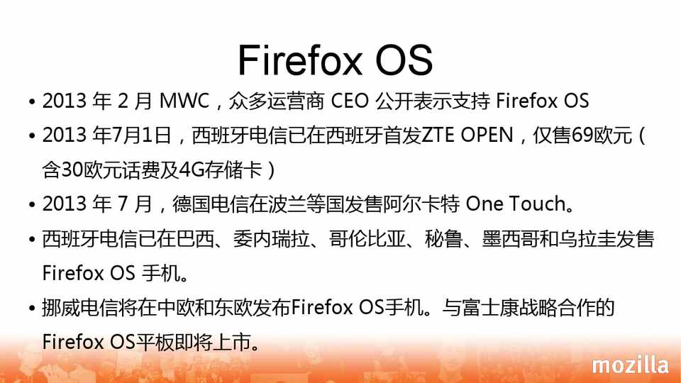 • 2013 年 2 月 MWC,众多运营商 CEO 公开表示支持 Firefox OS • 2013 年7月1日,西班牙电信已在西班牙首发ZTE OPEN,仁售69欧元(