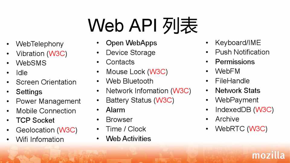 • Open WebApps • Device Storage • Contacts • Mouse Lock (W3C) • Web Bluetooth • Network Infomation (W3C) • Battery Status (W3C) • Alarm • Browser • Time / Clock • Web Activities