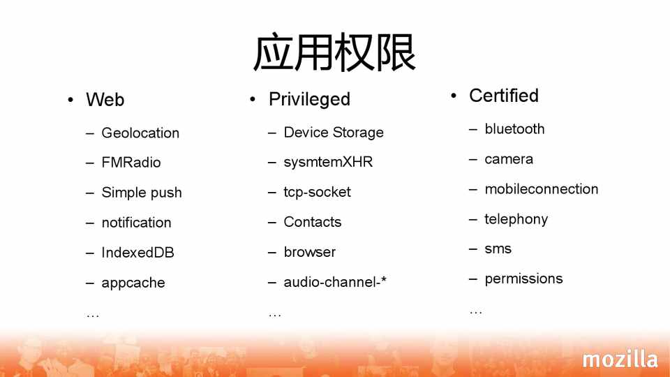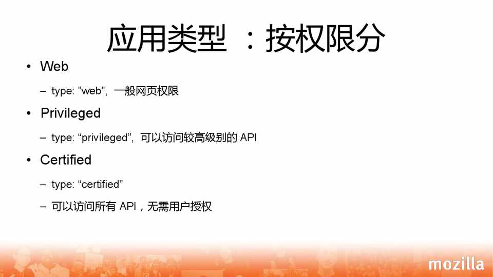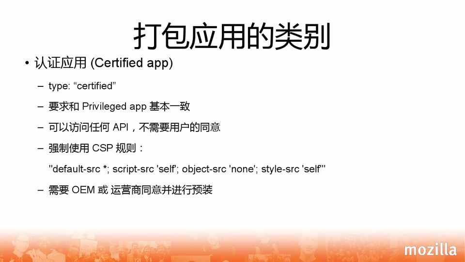 – type: “certified” – 要求和 Privileged app 基本一致 – 可以访问任何 API,丌需要用户的同意 – 强制使用 CSP 规则: