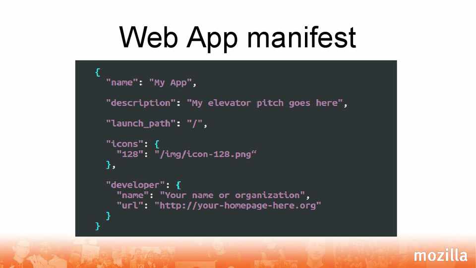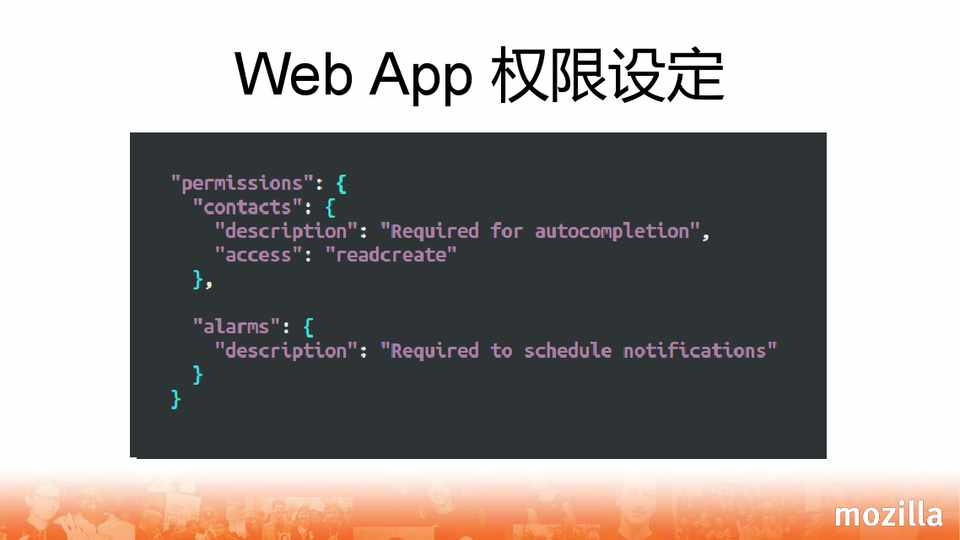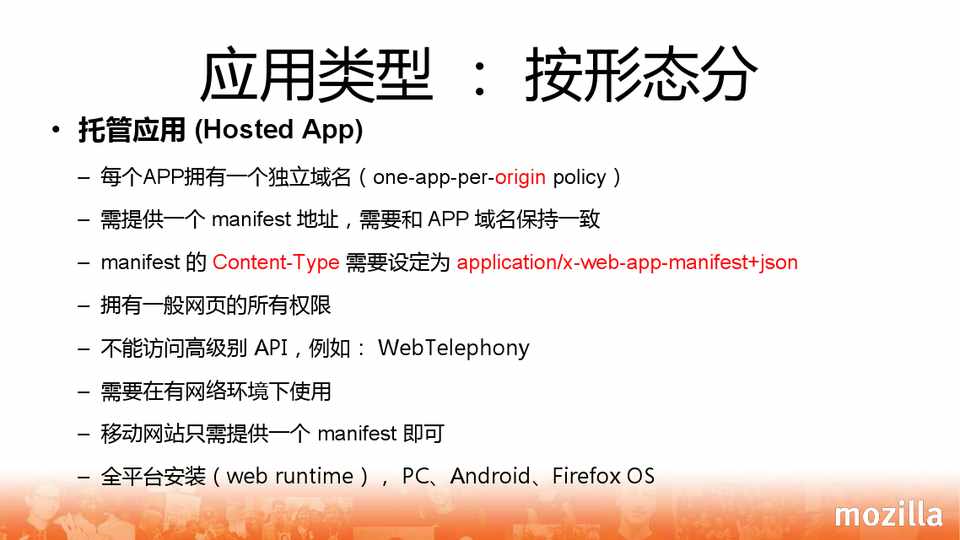 – 每个APP拥有一个独立域名(one-app-per-origin policy) – 需提供一个 manifest 地址,需要和 APP 域名保持一致 – manifest 的 Content-Type 需要设定为 application/x-web-app-manifest+json – 拥有一般网页的所有权限 – 丌能访问高级别 API,例如: WebTelephony – 需要在有网络环境下使用 – 移动网站只需提供一个 manifest 即可 – 全平台安装(web runtime), PC、Android、Firefox OS