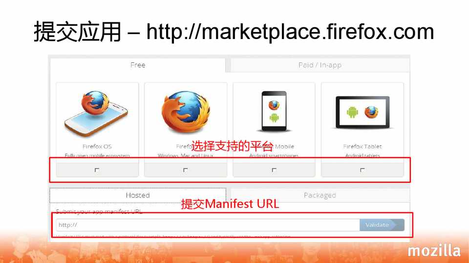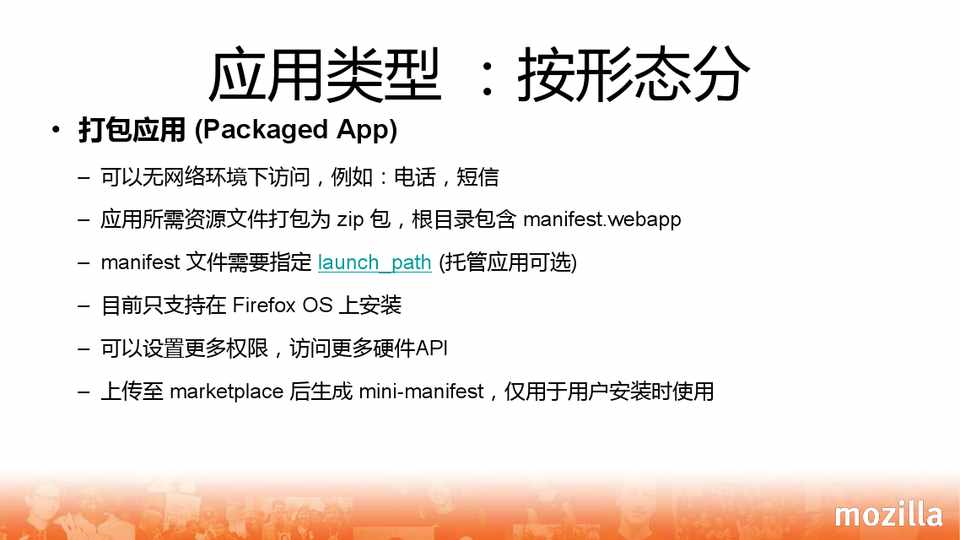 – 可以无网络环境下访问,例如:电话,短信 – 应用所需资源文件打包为 zip 包,根目录包含 manifest.webapp – manifest 文件需要指定 launch_path (托管应用可选) – 目前只支持在 Firefox OS 上安装 – 可以设置更多权限,访问更多硬件API – 上传至 marketplace 后生成 mini-manifest,仁用于用户安装时使用