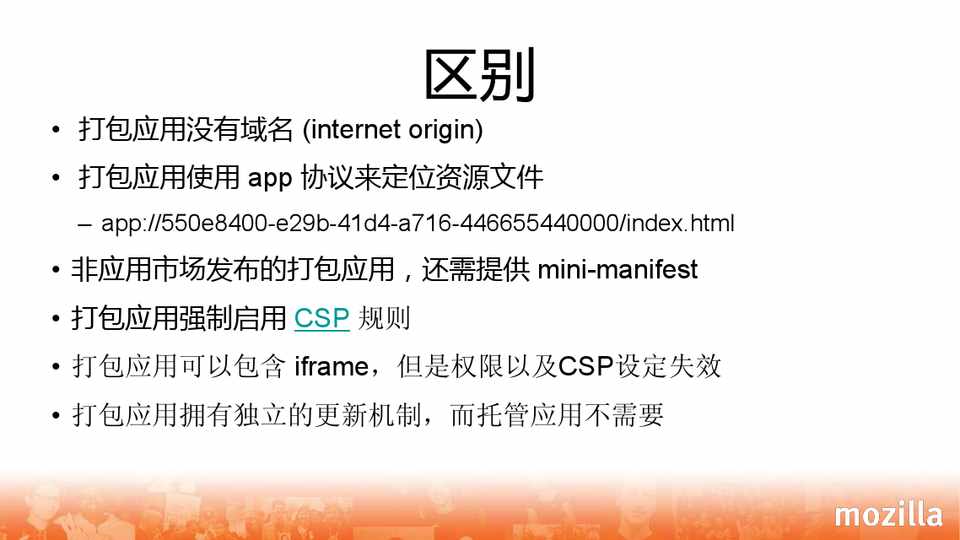 • 非应用市场发布的打包应用,还需提供 mini-manifest • 打包应用强制启用 CSP 规则 • 打包应用可以包含 iframe,但是权限以及CSP设定失效 • 打包应用拥有独立的更新机制,而托管应用不需要