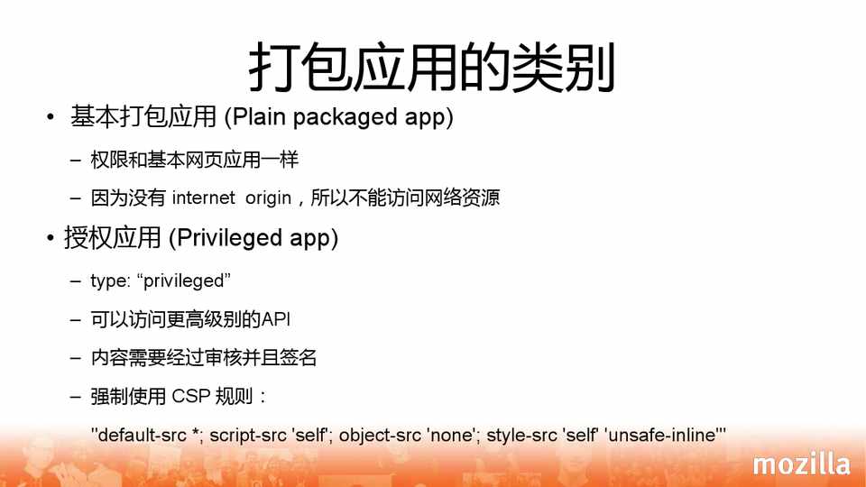 – type: “privileged” – 可以访问更高级别的API – 内容需要经过审核幵且签名 – 强制使用 CSP 规则: